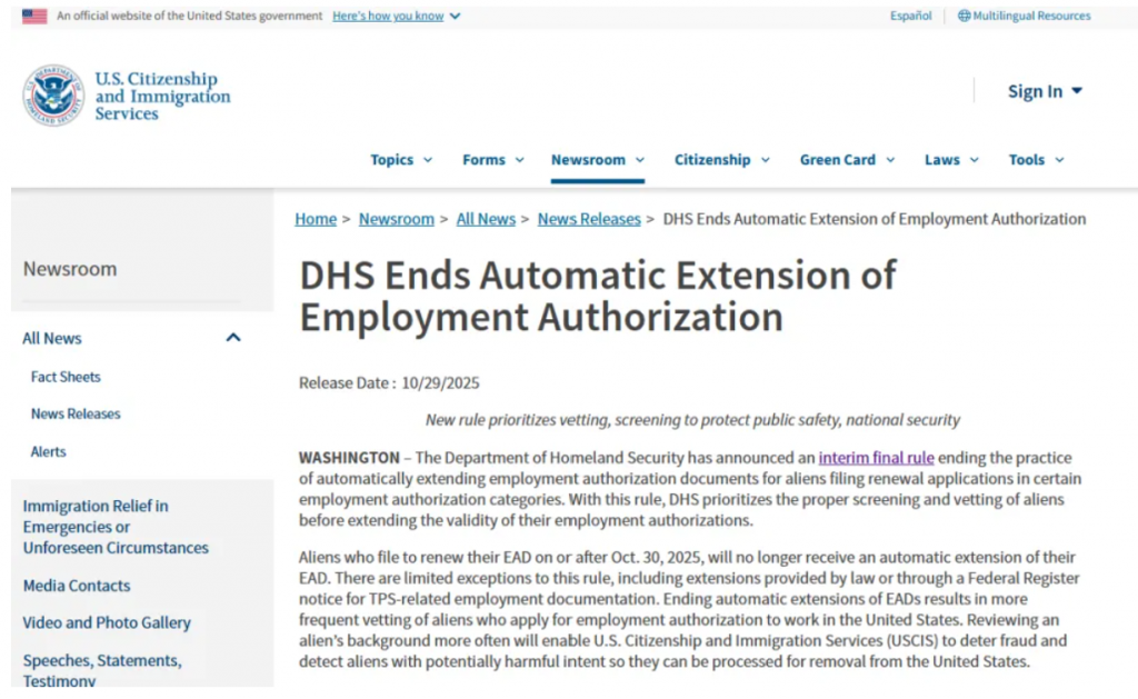 3. 例外情况:根据法律或联邦公报通知,临时保护身份(TPS)相关的就业文件自动延期政策不受此新规影响。