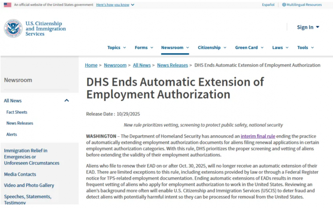 美国国土安全部(DHS)近日发布一项临时最终规定(interim final rule),宣布立即终止对特定类别工作许可(EAD卡)续签申请的自动延期政策。此前,符合条件的申请者在及时提交续签申请后,其工作许可可自动延长最多540天。这项重大变革旨在加强国家安全和公共安全,确保在授予新的工作权限前,对申请人进行充分的审查和背景调查。